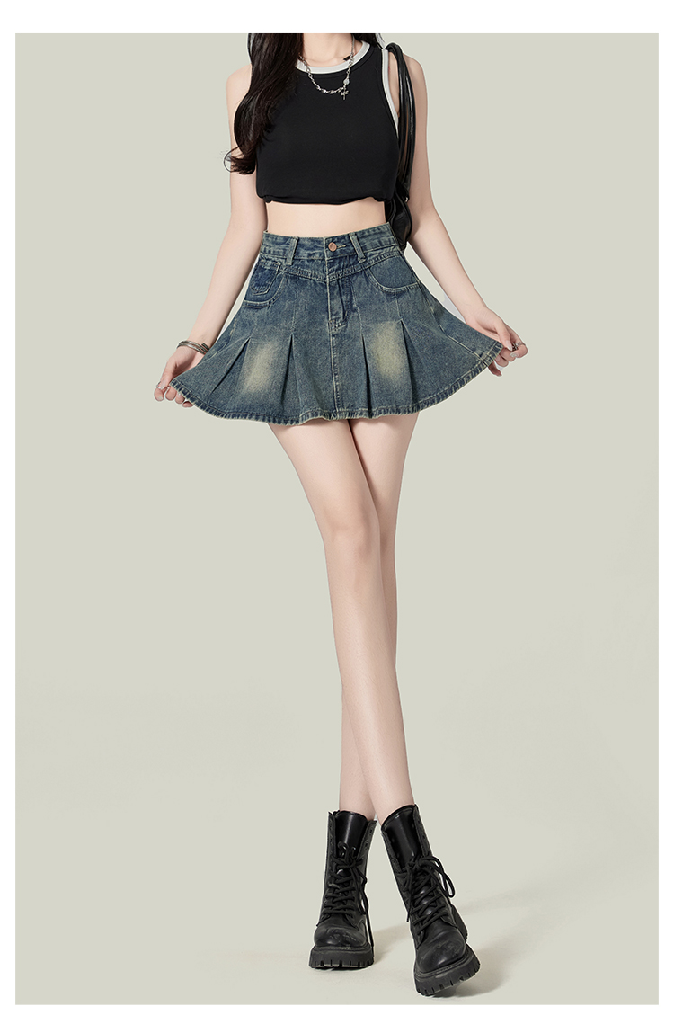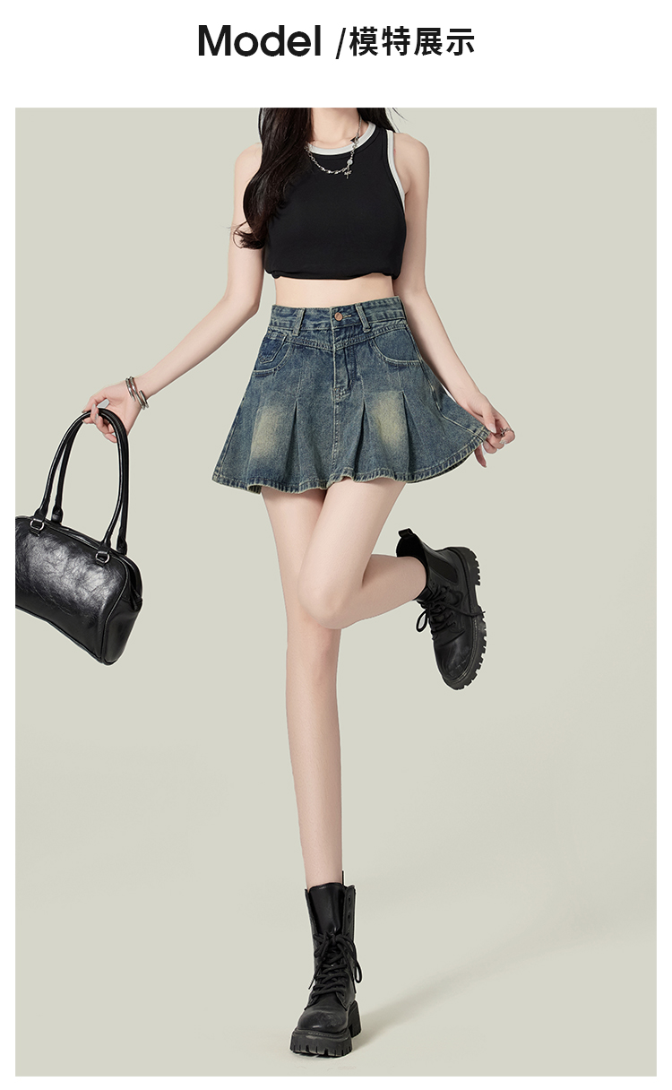 Forever21复古蓝辣妹包臀百褶牛仔短裙女高腰A字蓬蓬裙梨形半身裙