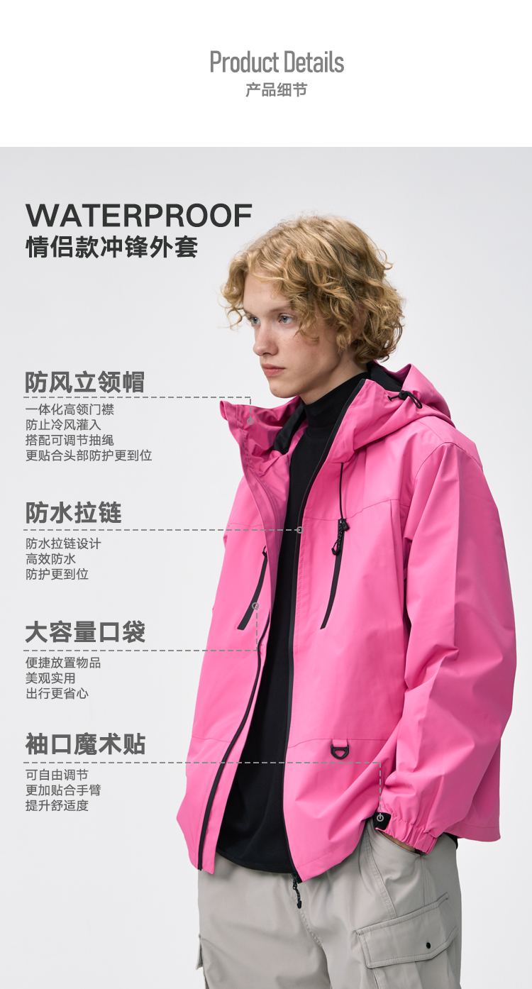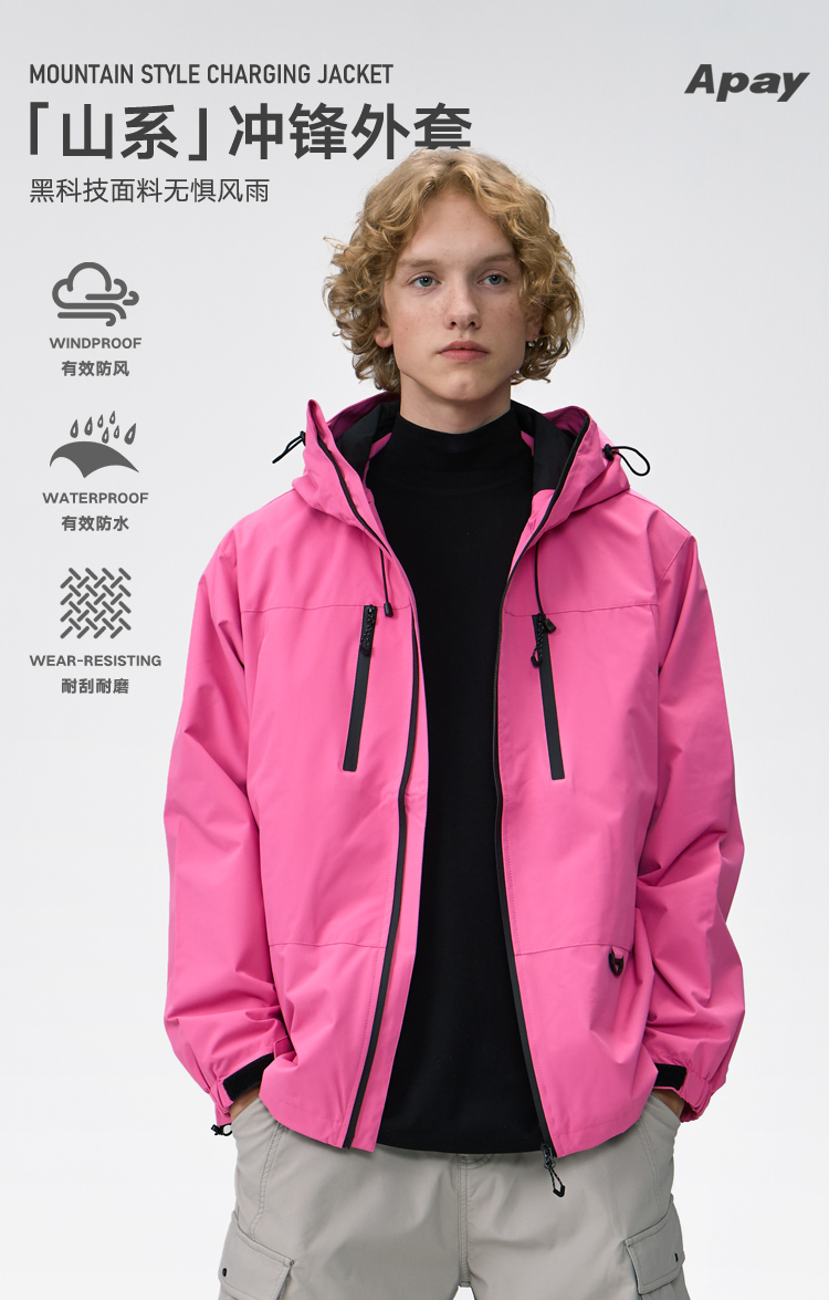 APAY户外运动冲锋外套男女粉色宽松薄款防泼水春季登山防风骑行服
