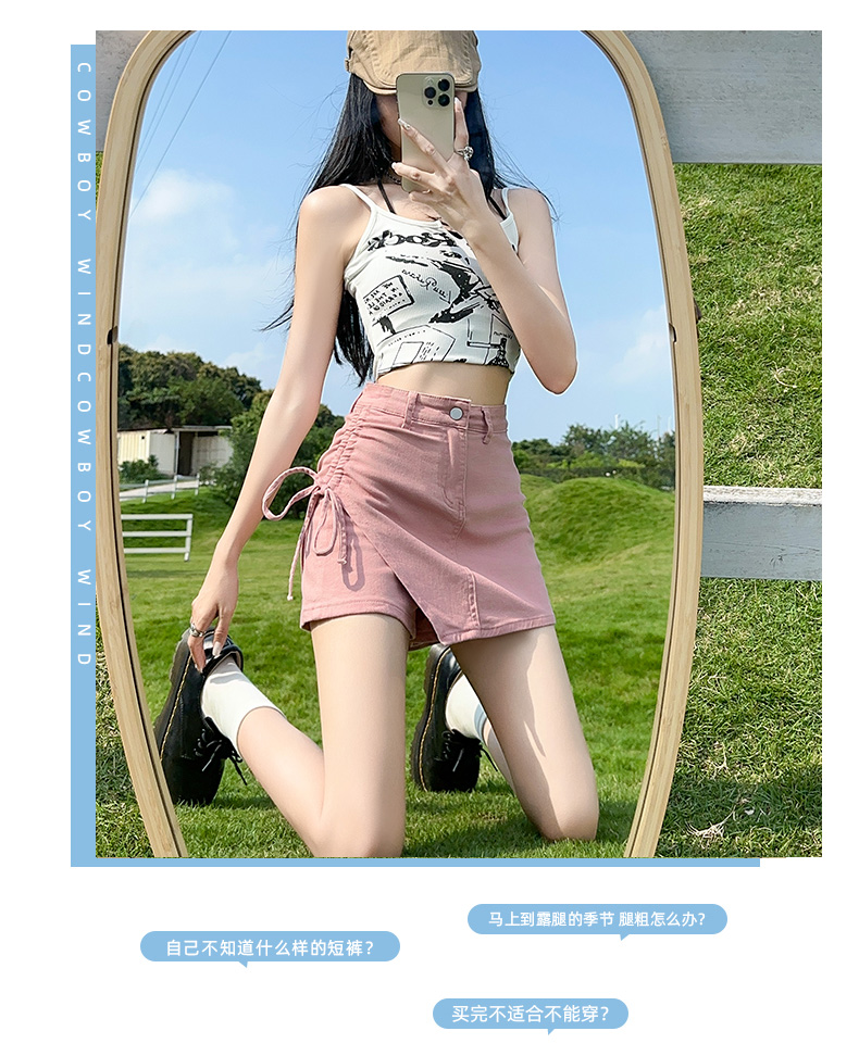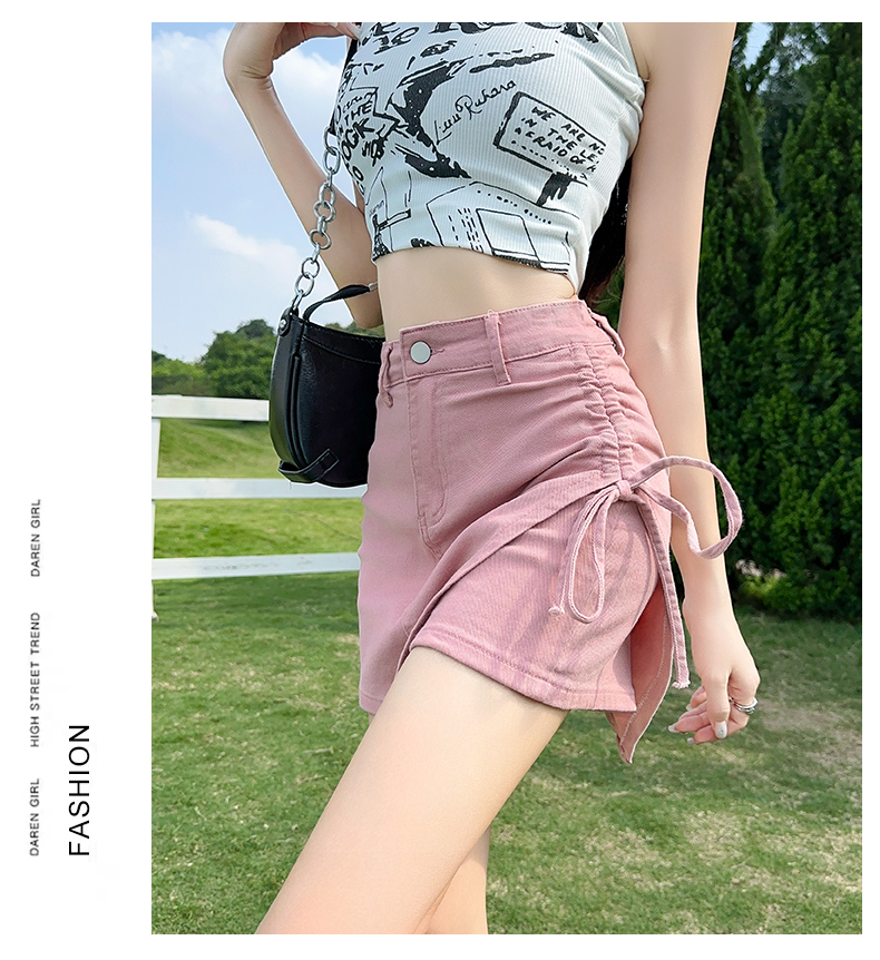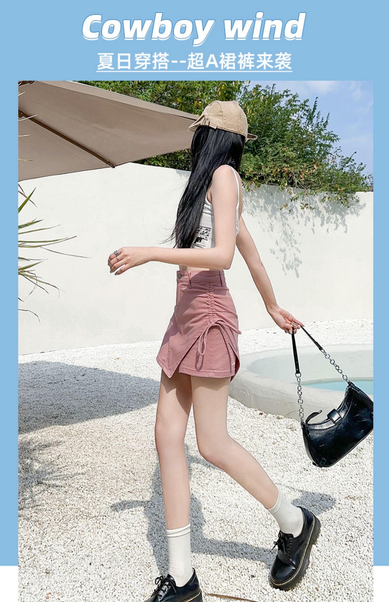 粉色牛仔短裙女夏季薄款不规则半身裙2025抽绳超A甜辣裙裤裤裙子