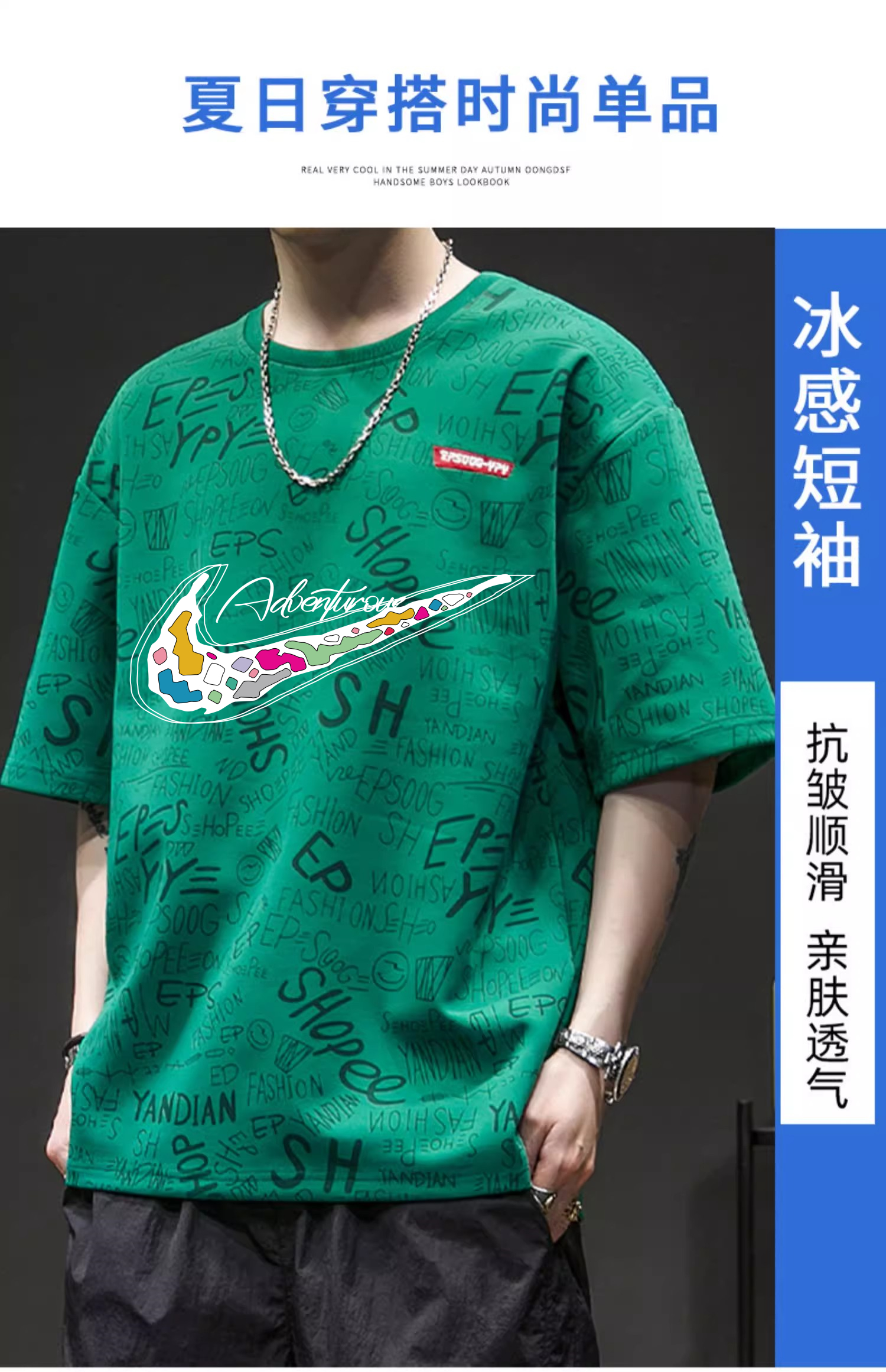耐克顿凉感冰丝短袖男夏季满印宽松休闲大码半袖绿色圆领运动上衣
